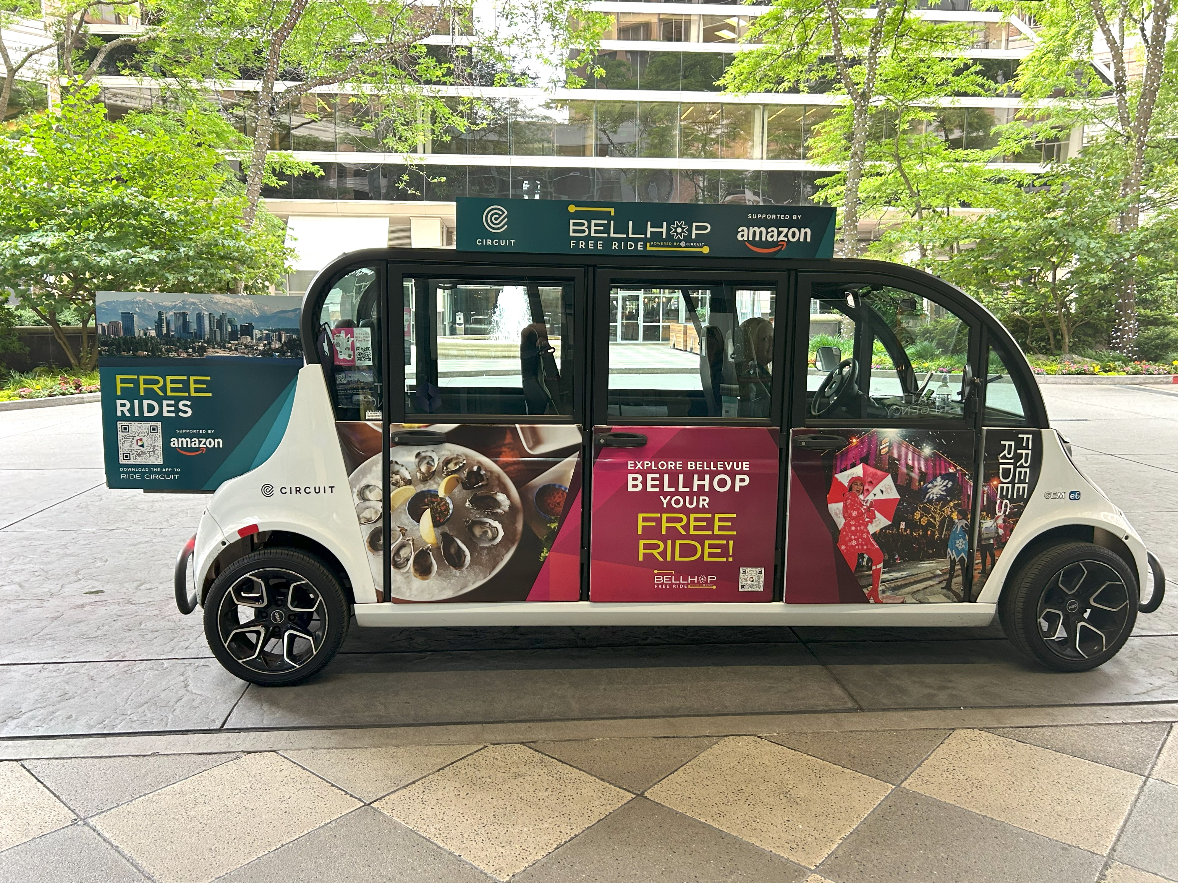 After scheduled event programming, utilize connected skywalks to explore one of the nation's greatest culinary scenes or jump on the BellHop (pictured below), Bellevue's 100% electric, on-demand, and free shuttle service.