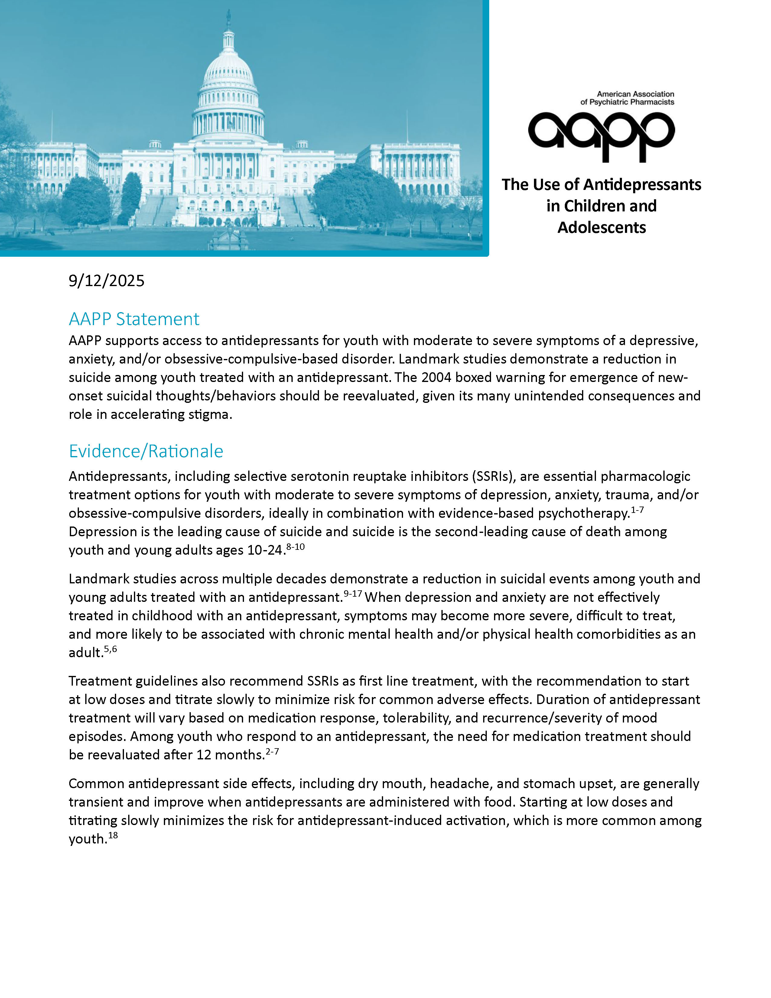 AAPP supports access to antidepressants for youth with moderate to severe symptoms of a depressive, anxiety, or obsessive-compulsive-based disorder and reconsideration of the boxed warning on new-onset suicidal thoughts/behaviors given its many unintended consequences and role in accelerating stigma. Psychiatric pharmacists are encouraged to use this policy brief to support your own advocacy for this gold-standard treatment.