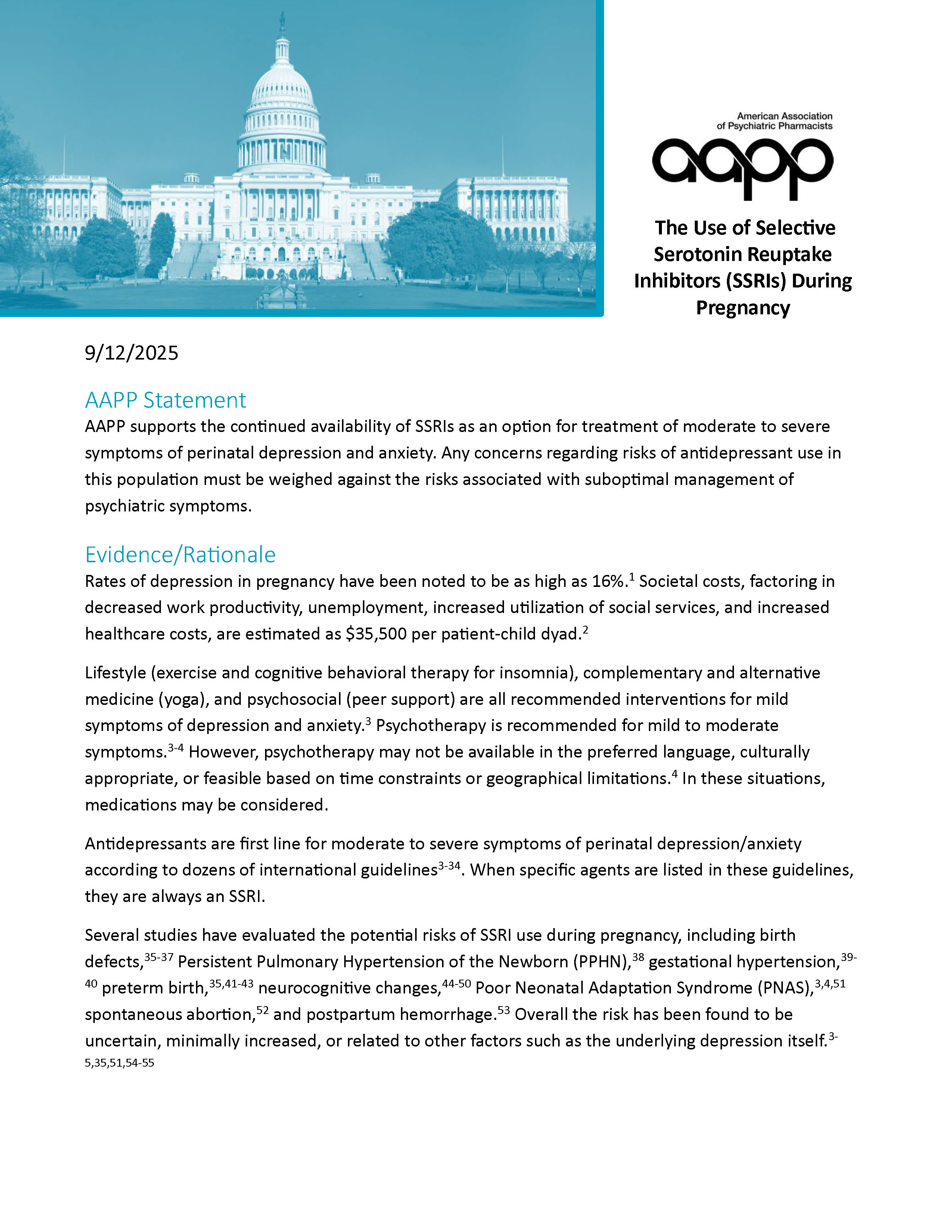AAPP supports the continued availability of SSRIs as an option for treatment of moderate to severe symptoms of perinatal depression and anxiety. Any concerns regarding risks of antidepressant use in this population must be weighed against the risks associated with suboptimal management of psychiatric symptoms. Psychiatric pharmacists are encouraged to use this policy brief to support your own advocacy for this gold-standard treatment.