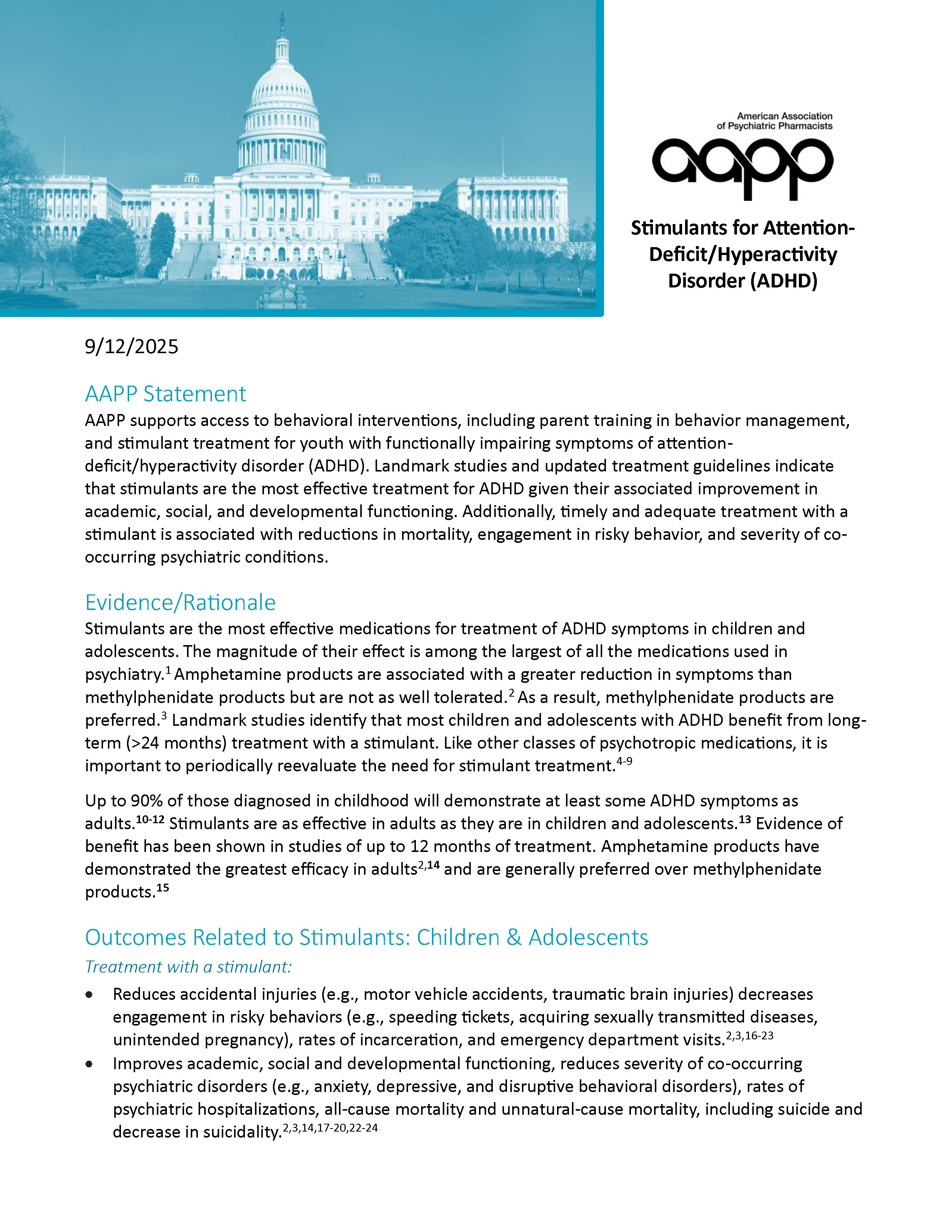 AAPP supports access to behavioral interventions, including parent training in behavior management, and stimulant treatment for youth with functionally impairing symptoms of attention-deficit/hyperactivity disorder (ADHD) as the most effective treatment for ADHD given their associated improvement in academic, social, and developmental functioning. Psychiatric pharmacists are encouraged to use this policy brief to support your own advocacy for this gold-standard treatment.