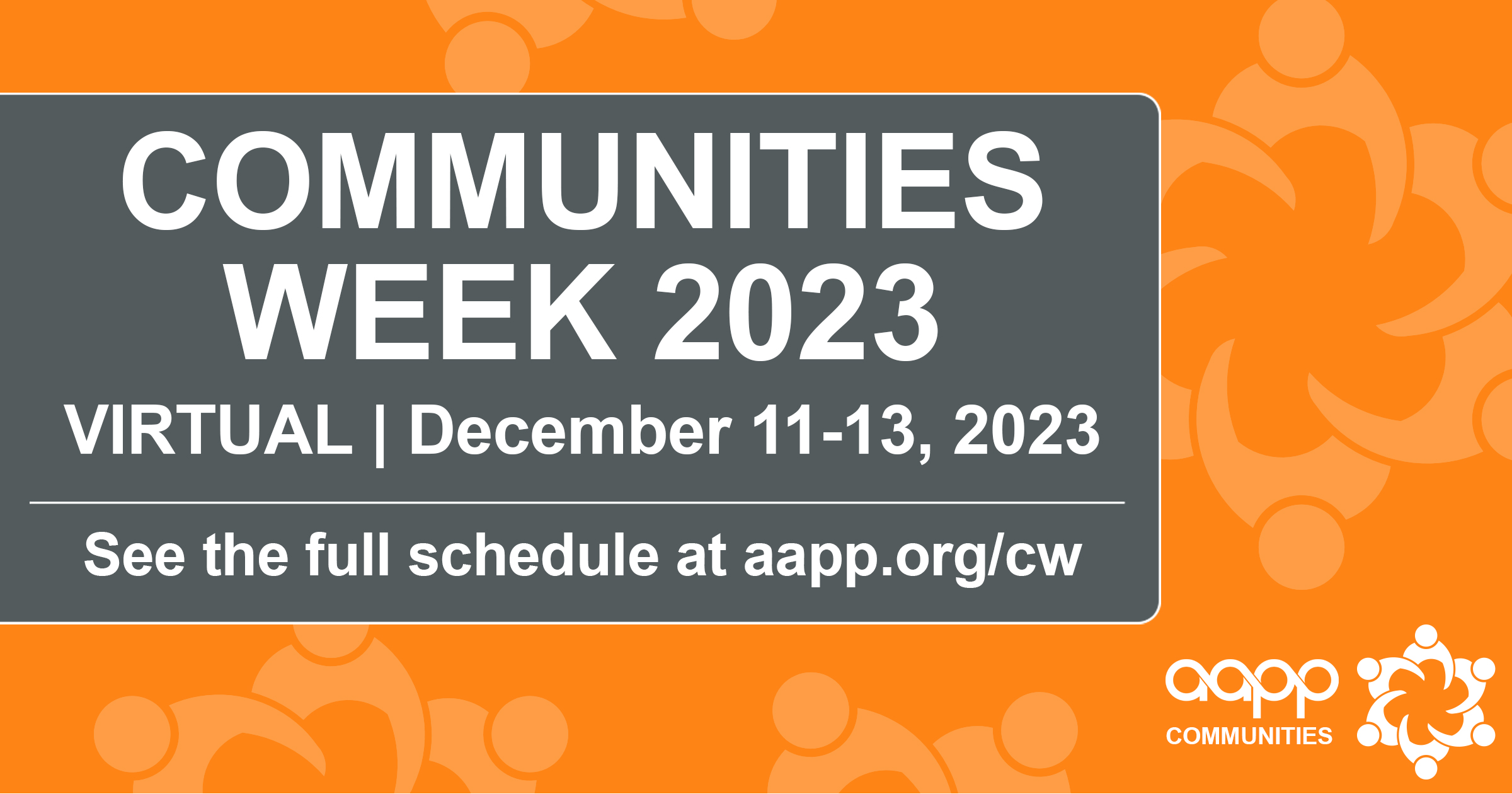 AAPP Communities Week is a 3-day virtual event, exclusively for AAPP members! This event will feature webinars from 10 AAPP communities, committees, and taskforces. Communities Week sessions are designed by your peers to focus on relevant, current issues in practice with intention to foster open discussion and information sharing. Please see the schedule below for more information.