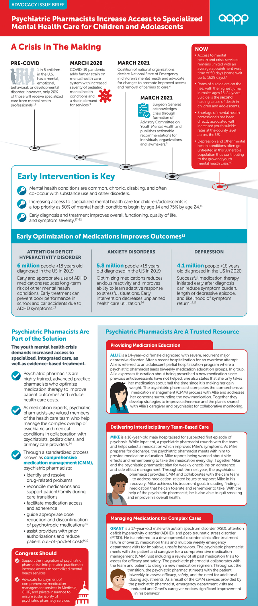 Access to specialized mental health and crisis professionals for children and adolescents is severely limited contributing to the growing youth mental health crisis. This issue brief outlines how psychiatric pharmacists are part of the solution to achieve both early intervention and optimization of medications to improve outcomes.